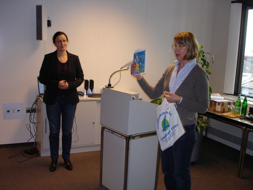 Ähnlich günstige Bedingungen führten zu einem speziellen Angebot, das Anja Haupt (Sprachheilberatung im Gesundheitsamt Emden) vorstellte: sie hat einen Service zur Ausleihe von Sprachfördermaterialien im Gesundheitsamt Emden aufgebaut, von dem sich die Anwesenden auch direkt inspirieren lassen konnten, da die Materialien in den Pausen in Augenschein genommen werden konnten.