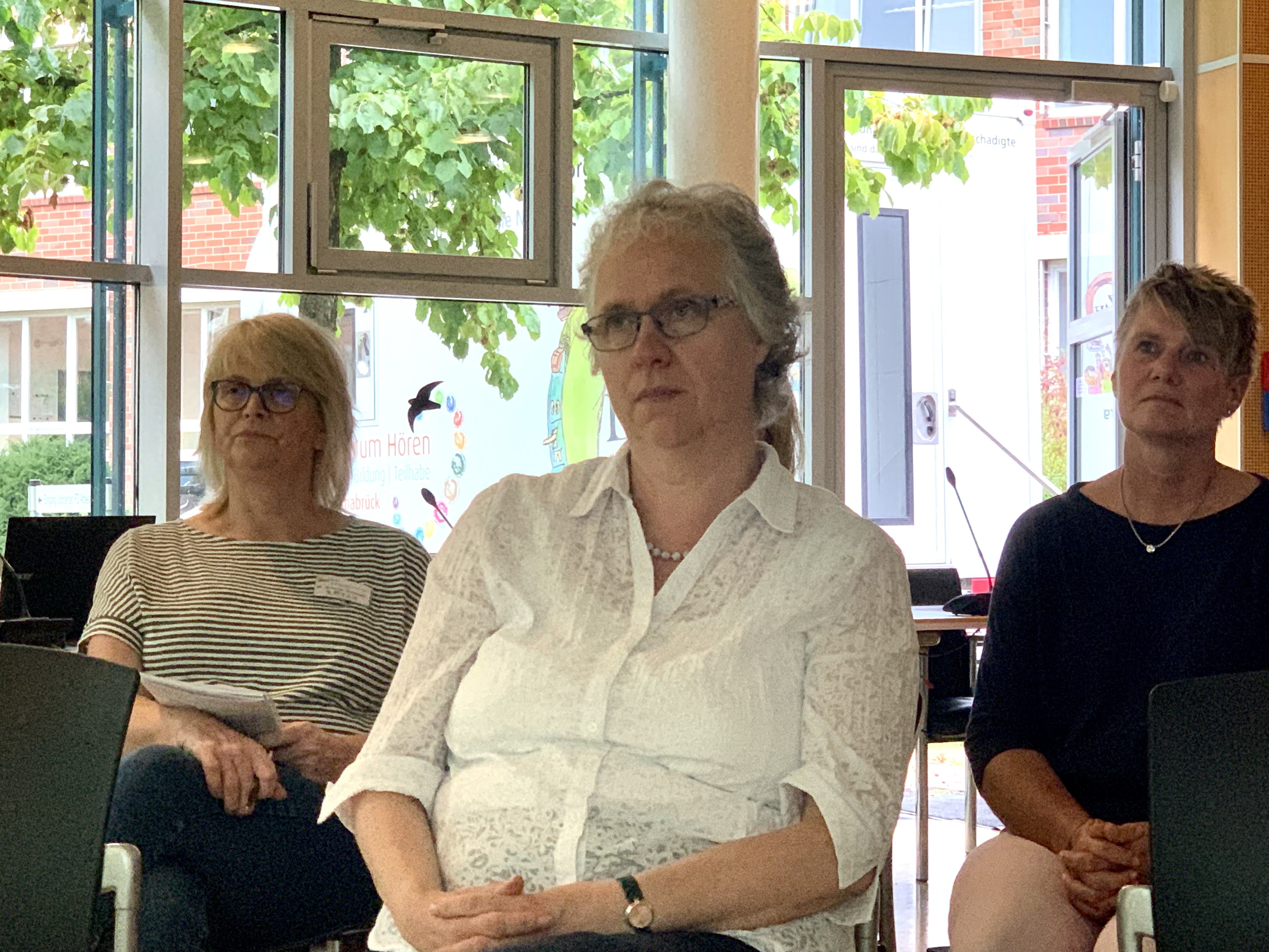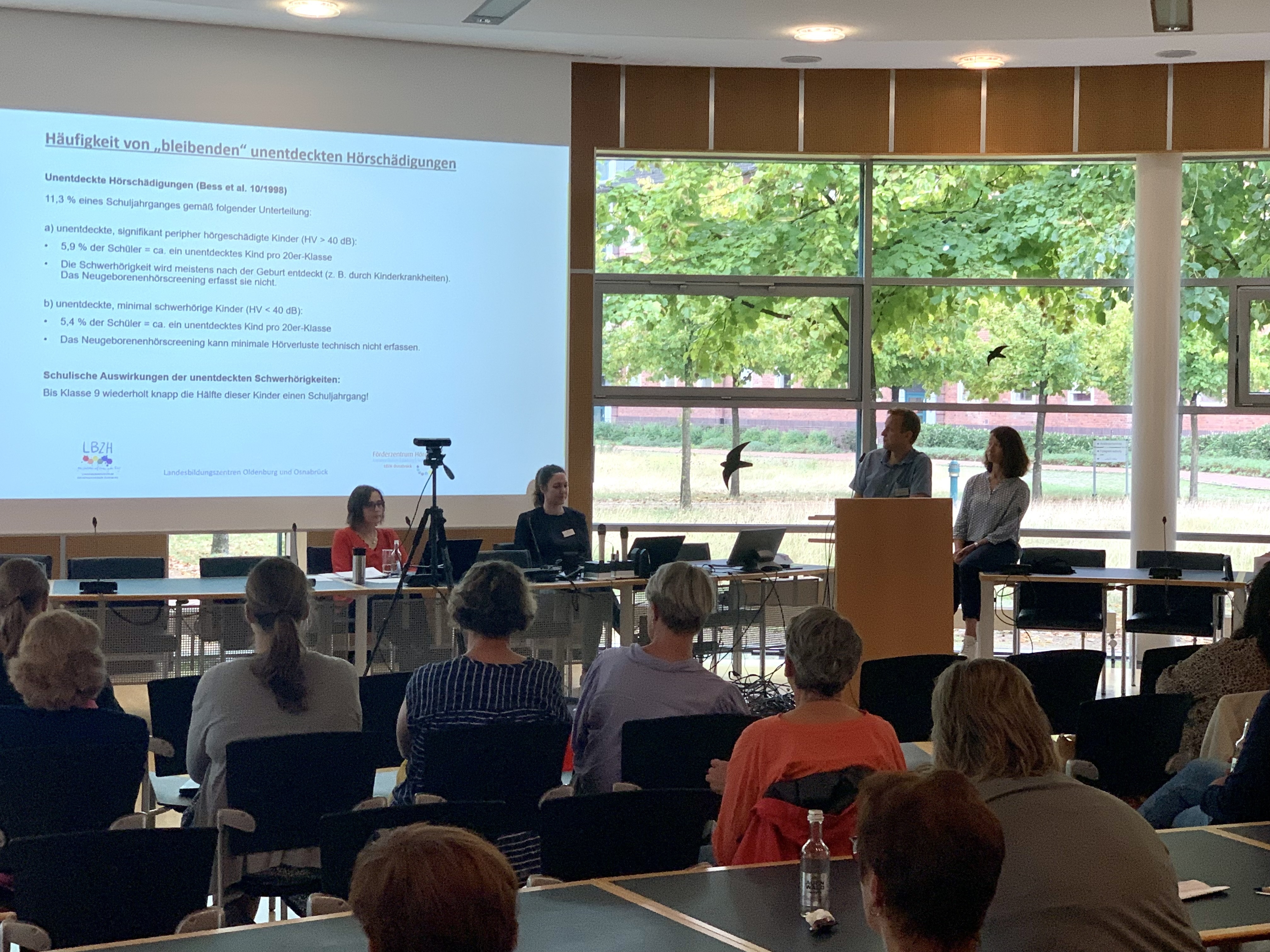 Nach den herzlichen Begrüßungsworten durch die 1. Kreisrätin Frau Tryta stand der Vormittag der 10. Verdentagung ganz im Zeichen der pädagogischen Audiologie. Dankenswerterweise konnten die Referent*innen Frau Studiendirektorin Petra Feuerböther vom LBZH Oldenburg und Herr Oberstudienrat Karsten Gregor vom LBZH Osnabrück für einen sehr gelungenen Vortrag zum Thema gewonnen werden. Von besonderem Interesse war für die Zuhörer*innen unter anderem der Themenkreis Paukenergüsse und die damit verbundenen Auswirkungen. Hier gab es aus dem Publikum die meisten Nachfragen. Weitere Inhalte finden sich in der PowerPoint Präsentation. Ein besonderes Highlight war im Anschluss die Besichtigung des Hörmobils.