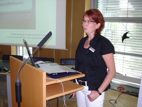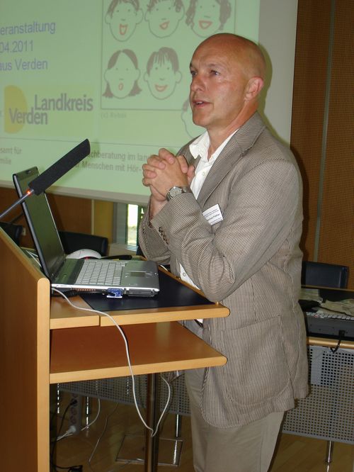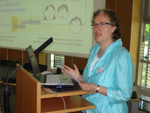 Am 28.06.2011 fand im Kreishaus Verden eine landesweite Tagung für diejenigen Mitarbeiterinnen und Mitarbeiter aller niedersächsischen Gesundheitsämter statt, die im Rahmen der Sprachheilfürsorge gemeinsam mit den Kinder- und Jugendärztinnen und -ärzten aus den Ämtern und den Fachberatern im landesärztlichen Dienst für Menschen mit Hör- und Sprachstörungen aus dem Niedersächsischen Landesamt für Soziales, Jugend und Familie (Landessozialamt - LS) Maßnahmen der Wiedereingliederungshilfe für Kinder mit Hörschädigungen und Sprachentwicklungsstörungen planen. Ziel dieser Tagung war ein Erfahrungsaustausch zur Harmonisierung, Sicherung und Steigerung der Standards der Arbeit in den kommunalen Gesundheitsämtern von ganz Niedersachsen. Über 60 Personen waren an diesem schönen warmen Sommertag nach Verden gekommen.