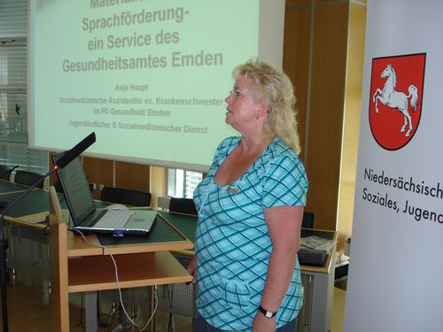 - Anja Haupt (Gesundheitsamt der Stadt Emden) stellte ein besonderes Angebot vor: in Emden können Einrichtungen oder Eltern Materialien (Spiele, Bücher etc.) zur gezielten Förderung sprachlicher oder auditiver Kompetenzen ausleihen. Dieser Service wird mittlerweile gerne genutzt.