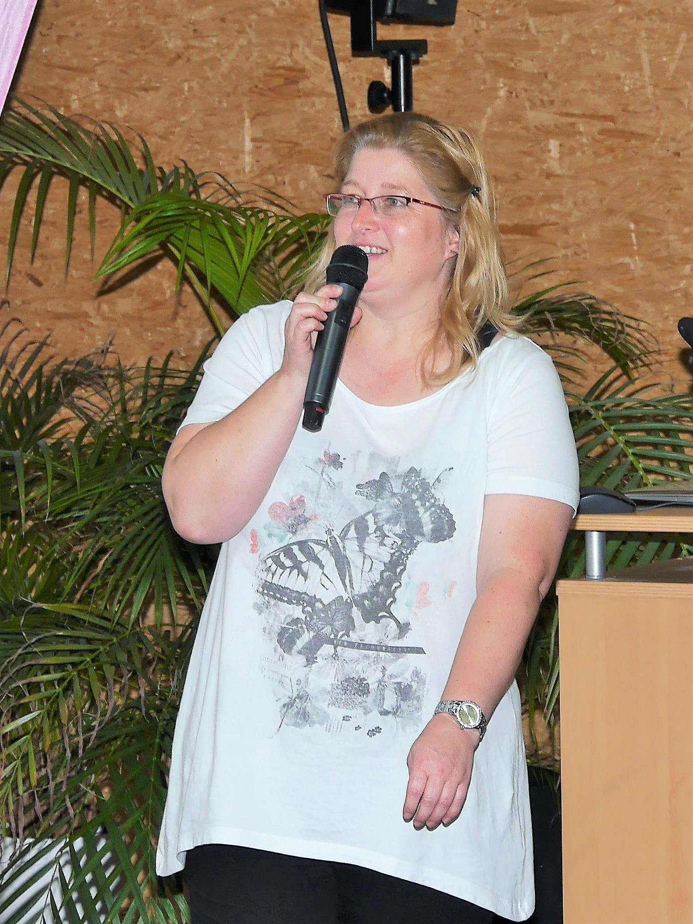 Katja Läppchen (Sprachheilkindergarten Helmstedt) hatte im Workshop den Einsatz von Musik und Singen in der Therapie vorgestellt. Im Plenum animierte sie alle 140 Gäste zum gemeinsamen Singen.