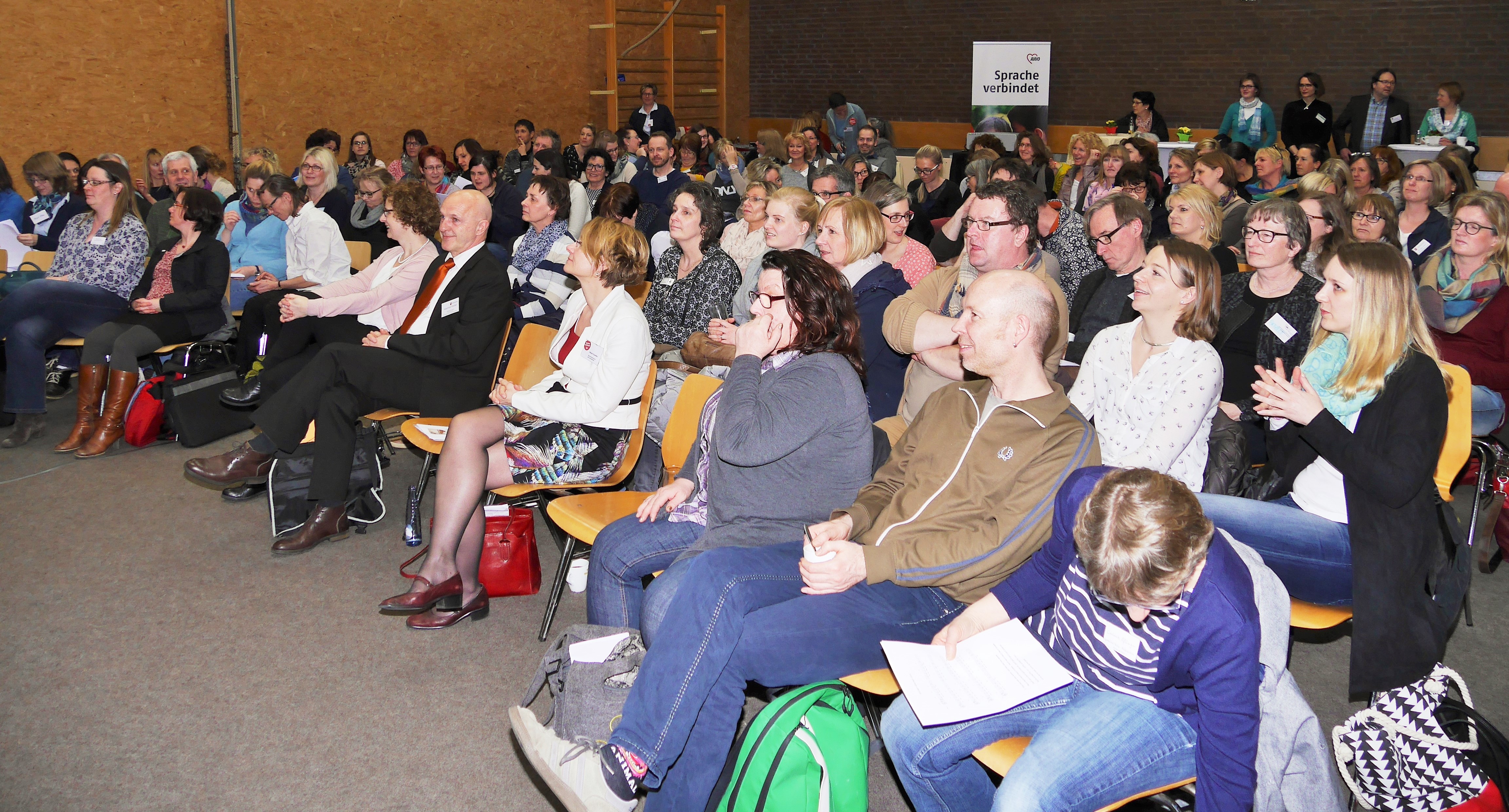 Zum 7. Mal trafen sich Fachkräfte aus den niedersächsischen Sprachheilkindergärten und Kindergärten für Hörgeschädigte mit dem Team Fachberatung Hören, Sprache und Sehen (Niedersächisches Landesamt für Soziales, Jugend und Familie - LS) zur landesweiten Konferenz "SpraKiKon" in Bad Salzdetfurth. Bei schönstem Wetter waren 140 Personen aus ganz Niedersachsen am 14.03.2017 in das AWO-Sprachheilzentrum Bad Salzdetfurth gekommen, um sich fachlich anregen zu lassen und sich über die Arbeit auszutauschen. In bewährter Tradition wurde das Programm von Mitarbeiterinnen aus den niedersächsischen Sprachheileinrichtungen gestaltet.