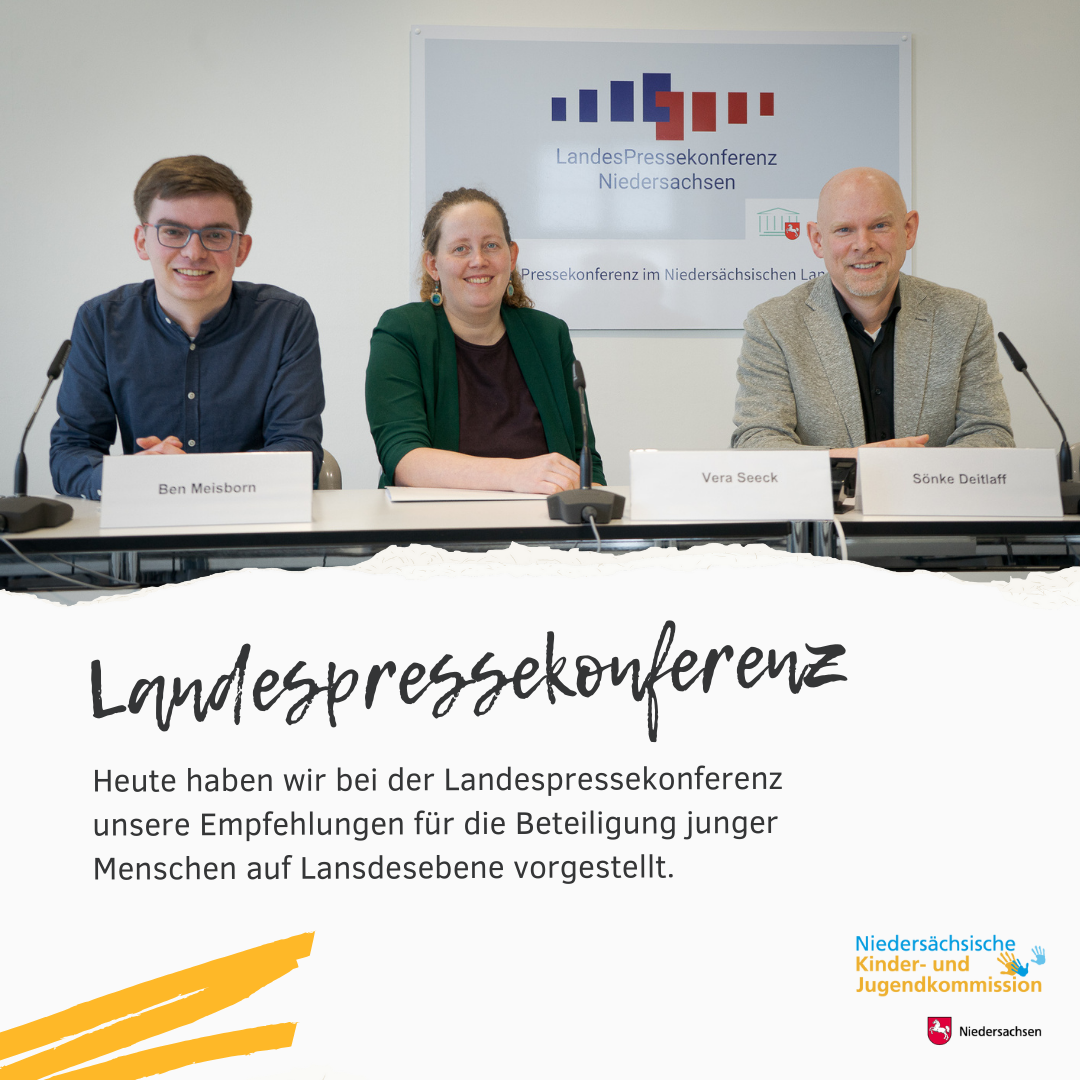 Die Niedersächsische Kinder- und Jugendkommission stellte drei konkrete Empfehlungen vor, mit denen die politische Beteiligung junger Menschen in Niedersachsen vorangebracht werden soll. So soll das Land einen Kinder- und Jugendcheck einführen, wie es ihn im Bund und in Thüringen bereits gibt. Bei einer Landesjungendkonferenz sollen junge Menschen direkt einbezogen werden. Zudem wird empfohlen, die verschiedenen Beteiligungsformate in einer Kinder- und Jugendbeteiligungsstrategie zusammenzuführen.