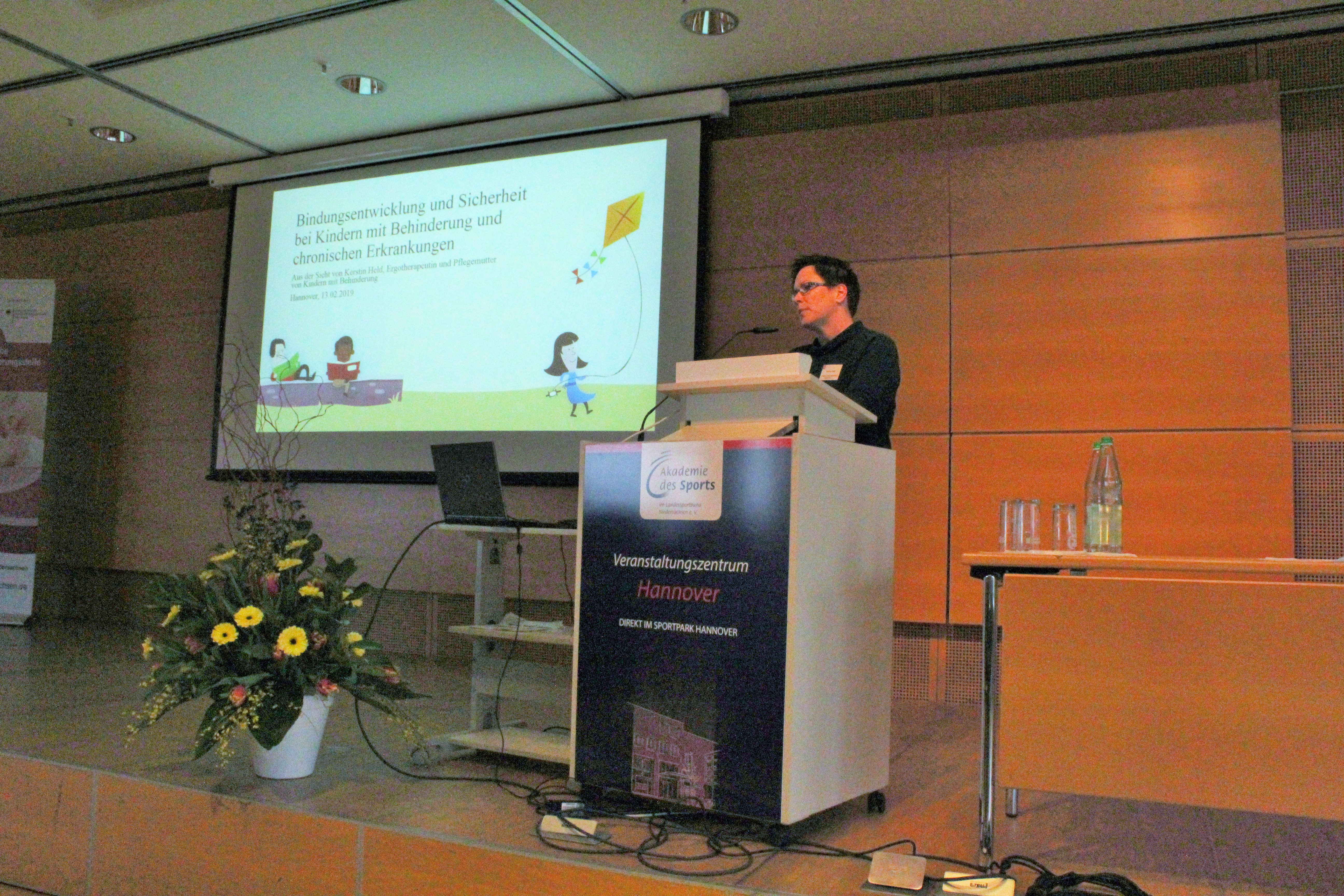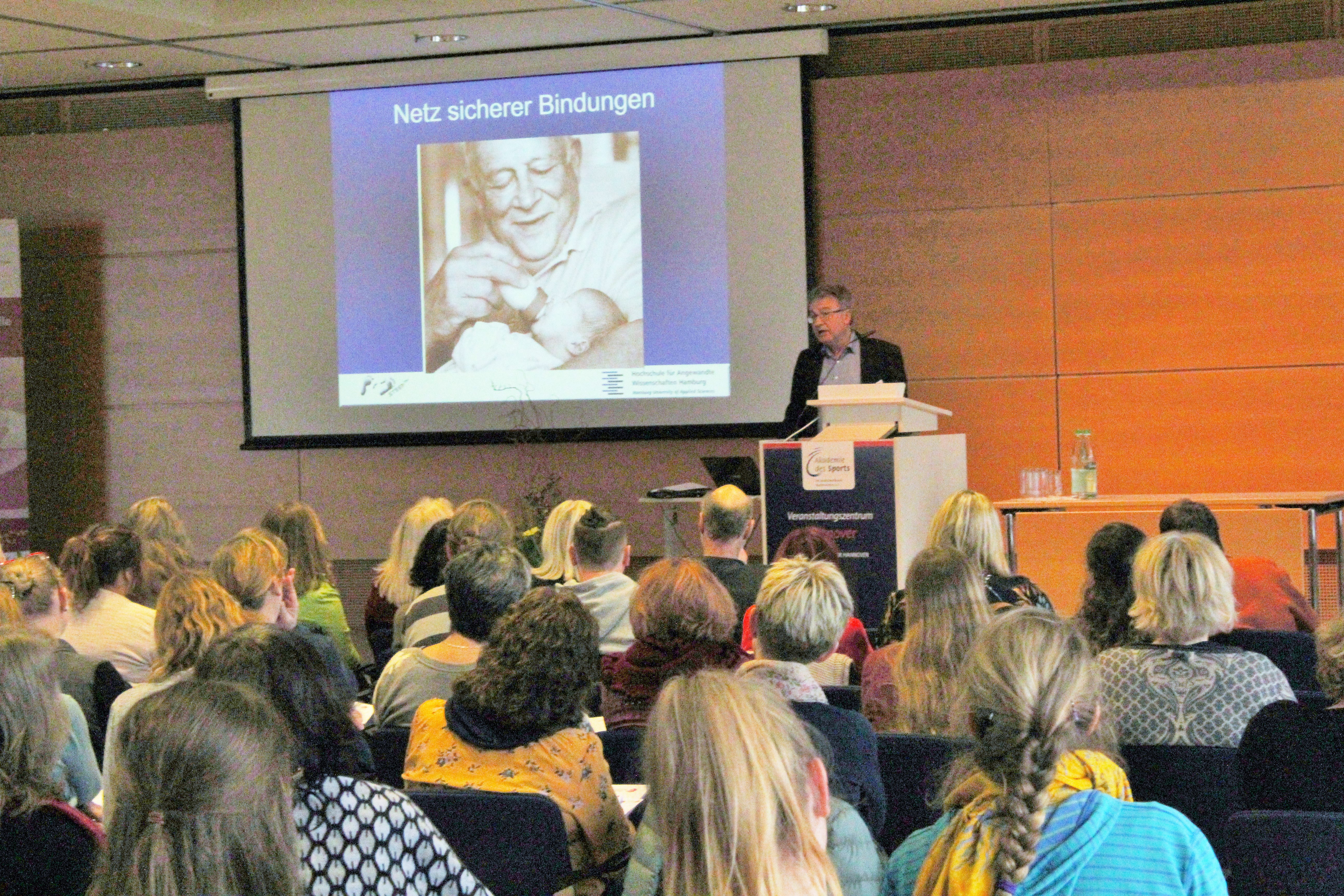 Prof. Dr. Gerhard Suess von der Hochschule für angewandte Wissenschaften in Hamburg sprach über den derzeitigen Stand der Bindungsforschung und schlug einen Bogen zur Praxis in den Frühen Hilfen. Er wies insbesondere darauf hin, dass sich Feinfühligkeit sowie der reflexive Umgang mit den eigenen Bindungserfahrungen dabei als zwei zentrale, grundlegende Mechanismen in der Bindungsentwicklung erwiesen hätten.