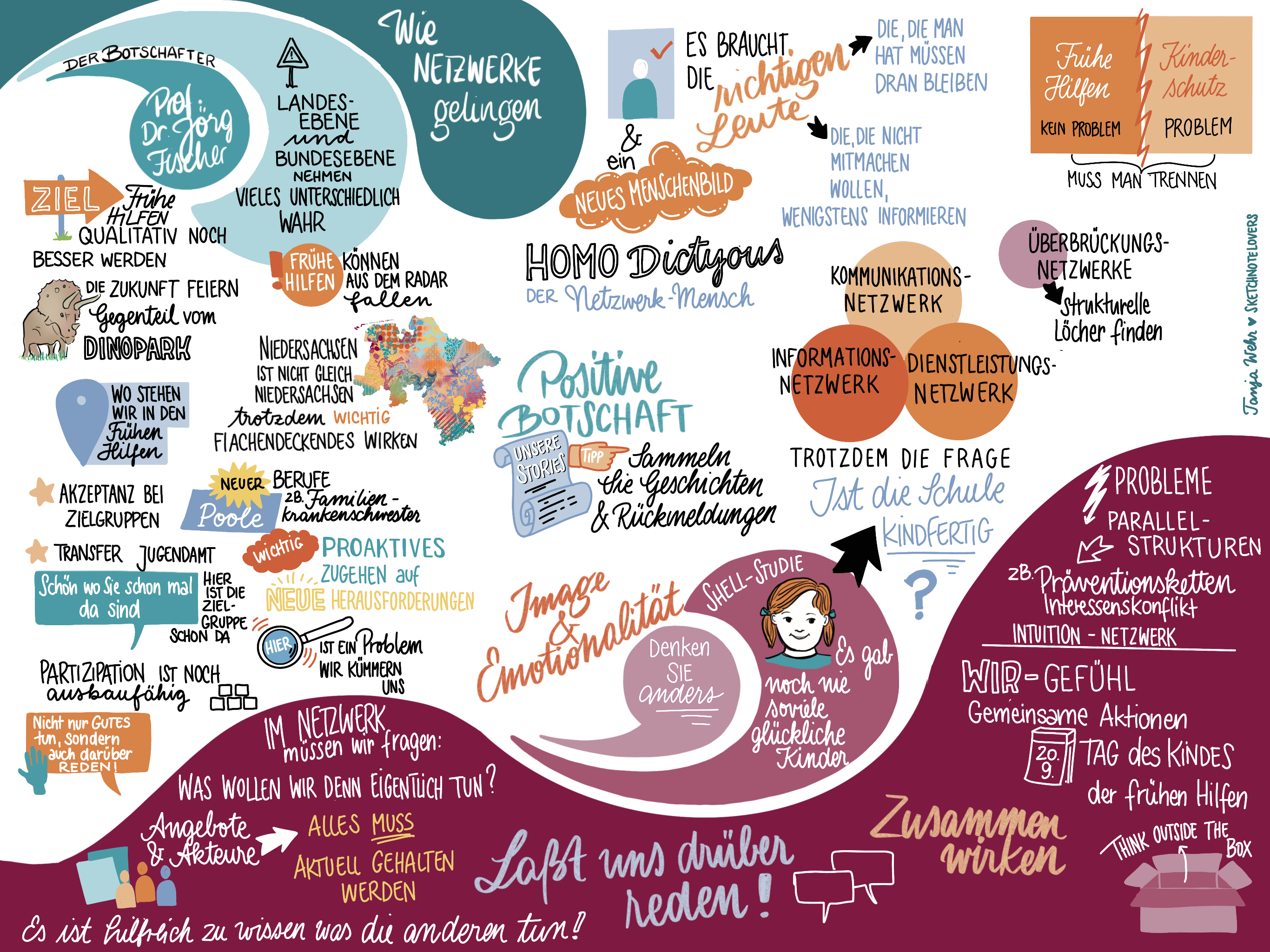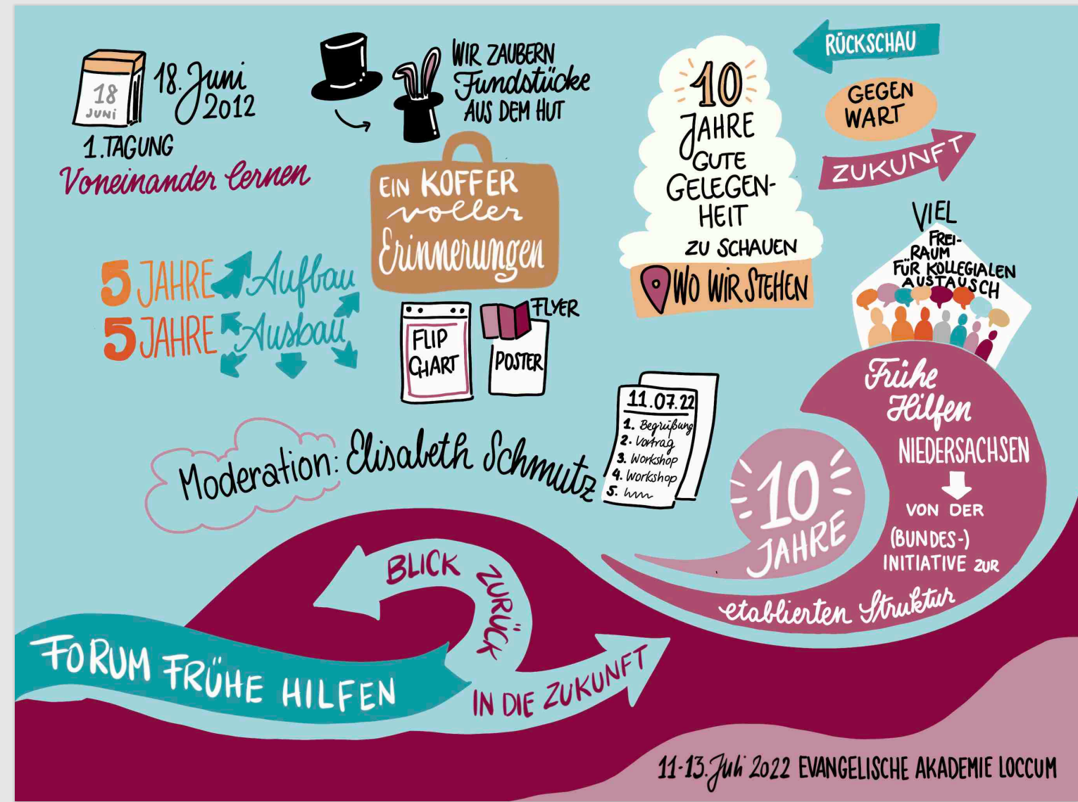 Aus Anlass der vor 10 Jahren erfolgten Verankerung der Frühen Hilfen im Bundeskinderschutzgesetz und der damit einhergehenden Einrichtung des Bundesfonds veranstaltete die Landeskoordinierungsstelle Frühe Hilfen vom 11.07.2022 bis zum 13.07.2022 ein dreitägiges Fachforum in der Evangelischen Akademie in Loccum. Über ein Jahr im Voraus wurde diese Veranstaltung gemeinsam mit Vertreterinnen und Vertretern der kommunalen Netzwerkkoordinierenden geplant. Unter dem Motto "Von der (Bundes)Initiative zur etablierten Struktur - Blick zurück in die Zukunft" gab es ausreichend Raum für breit angelegte Fachvorträge und Diskussionen zu aktuellen Themenstellungen in den Frühen Hilfen. Zielgruppe der Veranstaltung waren Netzwerkkoordinierende und koordinierende Fachkräfte der Frühen Hilfen in Niedersachsen. Bei den Hauptvorträgen durch Prof. Dr. Jörg Fischer, Prof. Dr. Reinhold Schone, Herrn Till Hoffmann und Herrn Erik Schäffer wurde den Fragen nachgegangen, wie Netzwerke gelingen, welche Besonderheiten und Entwicklungsbedarfe die Frühen Hilfen in ländlichen Räumen haben und wie die Verankerung der Frühen Hilfen in die Politik besser gestaltet werden kann. Das Programm umfasste zudem noch zahlreiche Workshops über aktivierende Methoden für Großgruppen, Moderationsmethoden sowie über aktuelle Themen der Frühen Hilfen. Des Weiteren konnte ein „Markt der Möglichkeiten“ realisiert werden, bei dem Best Practice Beispiele aus ganz Niedersachsen an kleinen Ständen und Plakatwänden vorgestellt wurden. Sogar ein Bus der Mobilen Frühen Hilfen aus dem Landkreis Oldenburg hatte sich auf die lange Reise nach Loccum begeben, um sich den Teilnehmerinnen und Teilnehmern einmal vorzustellen. Ein Höhepunkt des Forums war die Podiumsdiskussion im Programm. Hierbei sprachen Dirk Schröder, Abteilungsleiter des Niedersächsischen Sozialministeriums für den Bereich Jugend, Familie und Integration, Herr Dr. Dirk Härdrich als Sozialdezernent der Stadt Salzgitter, Herr Prof. Dr. Reinhold Schone, Till Hoffmann vom NZFH, Jens Schreiber in seiner Funktion als Jugendamtsleiter des Landkreis Stade sowie die Netzwerkkoordinatorin Frau Petra Bremke-Metscher aus Oldenburg über die zukünftigen Bedürfnisse und Ziele der Frühen Hilfen auf kommunaler und Landesebene. Besonders in den Blick gerückt wurden dabei die Punkte Finanzierung und Ressourcen, Jugendhilfeplanung, politisch-strukturelle Verankerung und Fachkräftemangel. Hierzu hatten die Teilnehmenden Forderungen und Visionen in Gruppen ausgearbeitet, zu denen Sie während der Podiumsdiskussion Stellung beziehen konnten. Die Veranstaltung wurde graphisch begleitet durch Tanja Wehr von Sketchnotelovers, die es eindrücklich schaffte, gekonnt und kreativ, die wesentlichen Aussagen und Stimmungen dieser Tagung zeichnerisch immer wieder auf den Punkt zu bringen. Die LaKo Frühe Hilfen bedankt sich bei allen Teilnehmerinnen und Teilnehmern sowie Referentinnen und Referenten für diese gelungene Jubiläumsveranstaltung. |