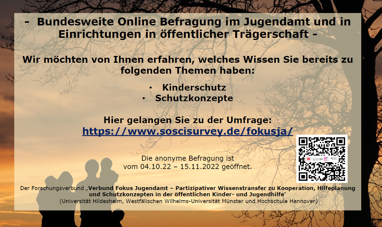 Von den Hochschulen und Universitäten Hannover, Hildesheim und Münster wird gemeinsam das Projekt „Fokus Jugendamt (FokusJa)“ im Rahmen der BMBF-Förderlinie „Forschung zu sexualisierter Gewalt gegen Kinder und Jugendliche in pädagogischen Kontexten“ eine bundesweite Onlinebefragung zu Schutzkonzepten in Jugendämtern und Einrichtungen in öffentlicher Trägerschaft durchgeführt.