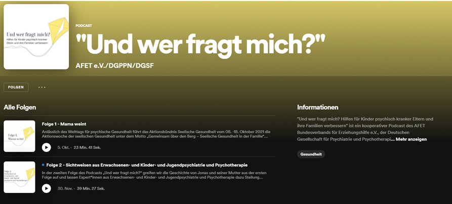 Anlässlich des Welttags für psychische Gesundheit am 10. Oktober 2021 startete das Aktionsbündnis Seelische Gesundheit für die Zeit vom 8. bis 18. Oktober 2021 ihre Aktionswochen. Unter dem Motto „Gemeinsam über den Berg – Seelische Gesundheit in der Familie“ ließen die Kooperationspartner*innen - AFET, DGSF und DGPPN - Betroffene in der ersten Folge einer Podcast-Reihe mit dem Titel "Und wer fragt mich? Hilfen für Kinder psychisch kranker Eltern und deren Familien verbessern" zu Wort kommen.